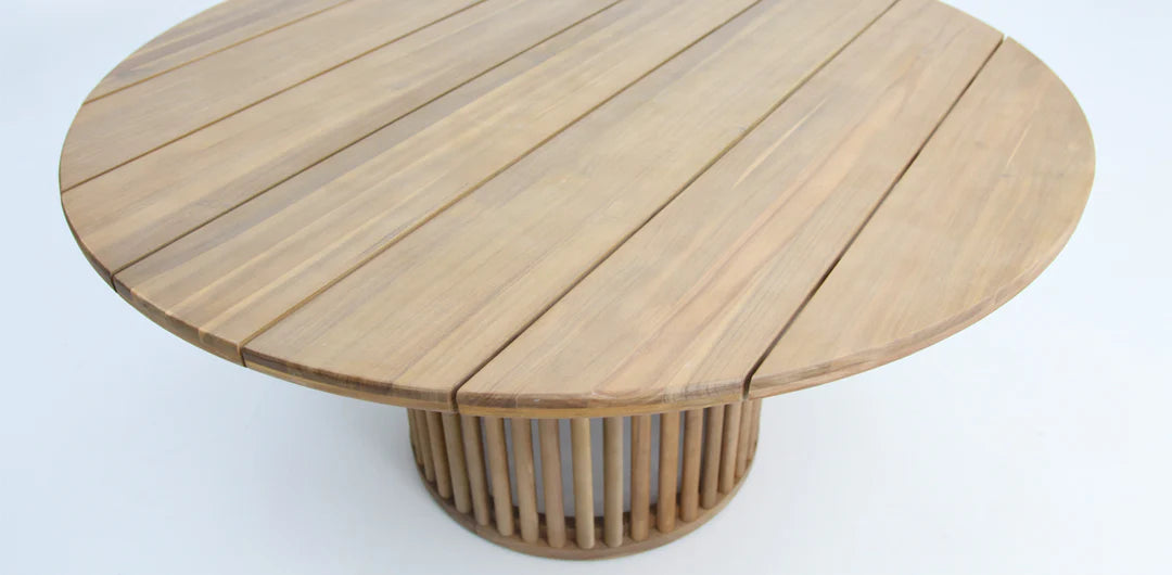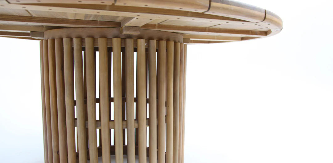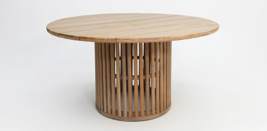 With its wide slatted tabletop and sculptural round base, the Cavella table provides a modern foundation for outdoor dining, while the morgan chairs add comfort and character through their supportive rope-woven backs and timber frames.